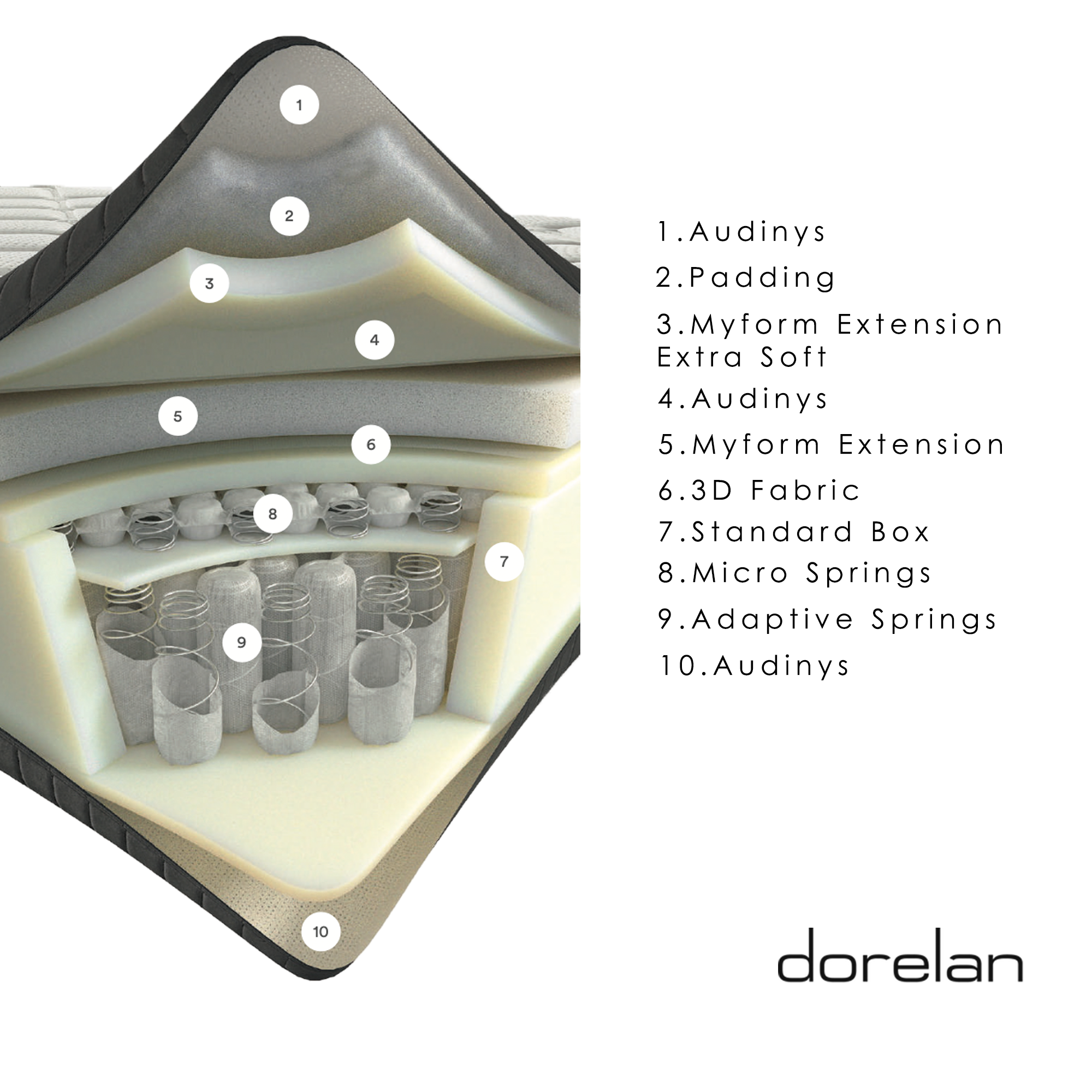 Dorelan yra Italijoje įsikūręs prestižinis bei specializuotas čiužinių, lovų, miego aksesuarų prekės ženklas. Daugiau nei 50 metų patirties turintis gamintojas, čiužinių siuvime pritaiko pažangias technologijas, naudoja tauriuosius, ekologiškus pluoštus, todėl užtikrina ilgaamžiškumą, komfortą bei amžiną dizainą. Dorelan griežtai orientuoti į aukščiausią kokybę, ergonomiką, estetiką bei sveiką miegą. Toks pasirinkimas skatina daug investuoti į mokslinius tyrimus, technologijas ir, svarbiausia, žmones. Gamintojas jau yra pripažintas visame pasaulyje, čiužinius sutiksite geriausiuose viešbučiuose, kruiziniuose laivuose, jachtose ar olimpinių sportininkų pasirinkimuose.