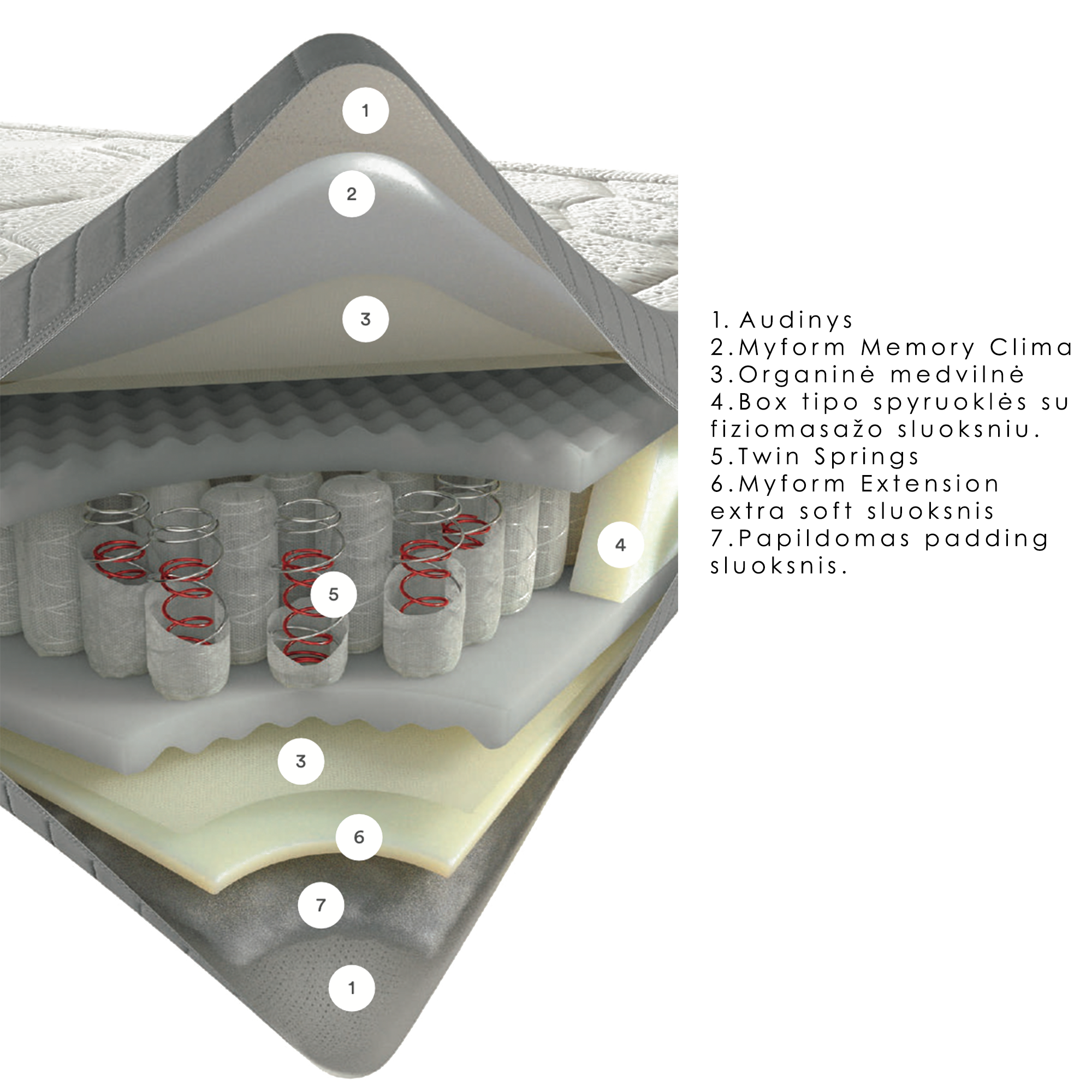 - 7 skirtingos zonos geresnei atramai ir miegui;